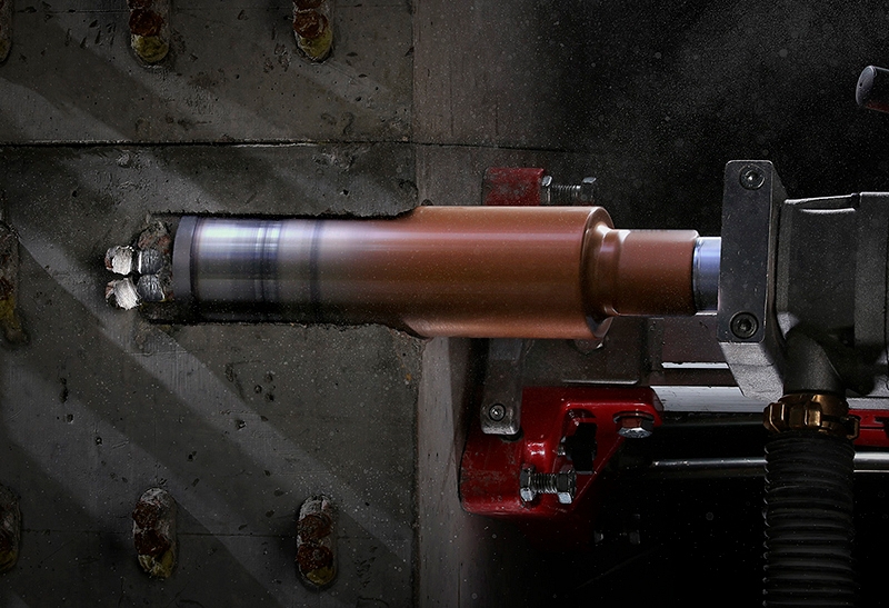 При алмазном бурении по технологии Diamond Hit процесс сверления происходит с микроударом высокой частоты, малой амплитуды и незначительной энергии удара - Высокая скорость сверления арматуры