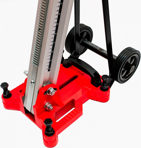 - Каретка перемещается по стойке вручную через пару "шестерня-зубчатая рейка", имеет регулируемые уголки из латуни, которые обеспечивают плавное скольжение и легкую подачу алмазной коронки