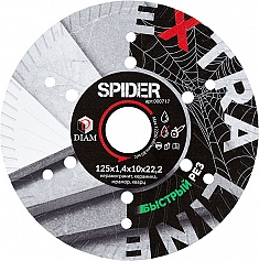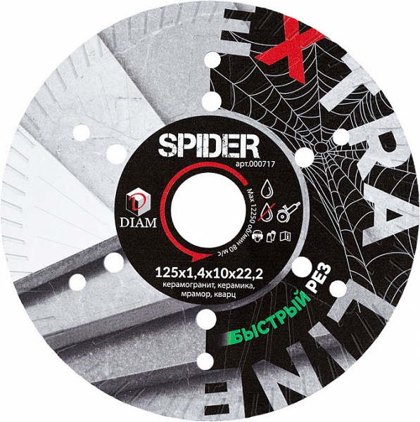 Алмазный диск Diam Extra Line Turbo Spider 125 мм (Диам Экстра Лайн Турбо Спайдер 125 мм) – специальный универсальный алмазный круг для сухой и мокрой резки керамогранита, керамики, кварцевого агломерата, мрамора, гранита, общестроительных материалов на ручном электроинструменте и системах резки длинномеров как с водяным охлаждением, так и без охлаждения.