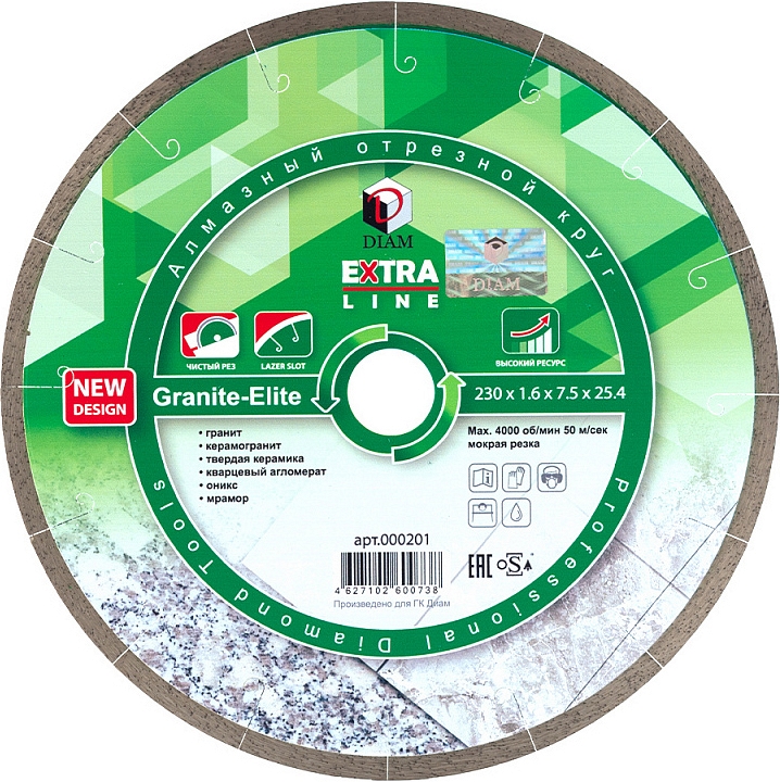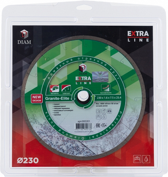 Алмазный отрезной круг Diam Extra Line 1A1R Корона Granite-Elite 230 мм (Диам Экстра Лайн 1А1Р Корона Гранит-Элит 230 мм) – премиальный алмазный диск для мокрой резки гранита, керамогранита, твердой керамики, кварцевого агломерата, оникса, мрамора, габбро, лабрадорита, базальта и других пород твердого натурального камня на болгарках (ушм), штроборезах, бензорезах, электрических резчиках и плиткорезах, стенорезных машинах с подачей воды. За долгое время зарекомендовал себя с отличной стороны у многих мастеров, как инструмент, обеспечивающий очень качественное выполнение задач практически по всем твердым материалам, при этом имеет очень большой ресурс и скорость работы.