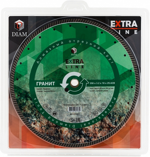 Алмазный отрезной круг Diam Extra Line Turbo Гранит 350 мм (Диам Экстра Лайн Турбо Гранит 350 мм) – специальный алмазный диск тип Turbo для сухой и мокрой резки гранитов, базальта, сланца, железобетона и других твердых материалов.