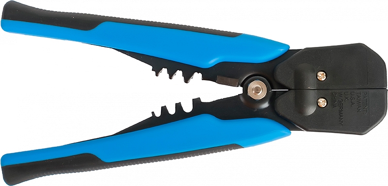 Автоматический многофункциональный стриппер КВТ WS-04A (KVT ВС-04А) с винтом микронастройки предназначен для снятия изоляции с проводов сечением 0,05 – 10 мм², резки проводов сечением до 10 мм², снятия оболочки с плоских проводов ВВГ-П и ПУНП, опрессовки изолированных с красной, синей и желтой манжетами наконечников, неизолированных наконечников, автоклемм под двойной обжим 0,5 – 6 мм².