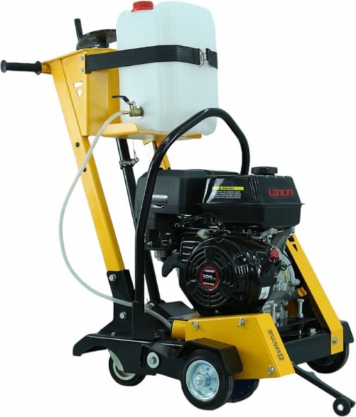 - Бензиновый двигатель Loncin G390F обеспечивает необходимую автономность работ в полевых условиях: в обычном режиме работы при глубине прямоугольного реза 6 см и ширине 1 см достигается скорость 1 м/мин по асфальту и 0,5 м/мин по бетону