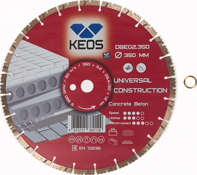 Диск алмазный сегментный Keos Universal Construction 350 мм (Кеос Универсал Констракшен 350 мм) предназначен для резки бетона, железобетона и кирпича на бензорезах, электрических резчиках и плиткорезах, каменерезных станках, стенорезных машинах, швонарезчиках, как с подачей воды, так и всухую.