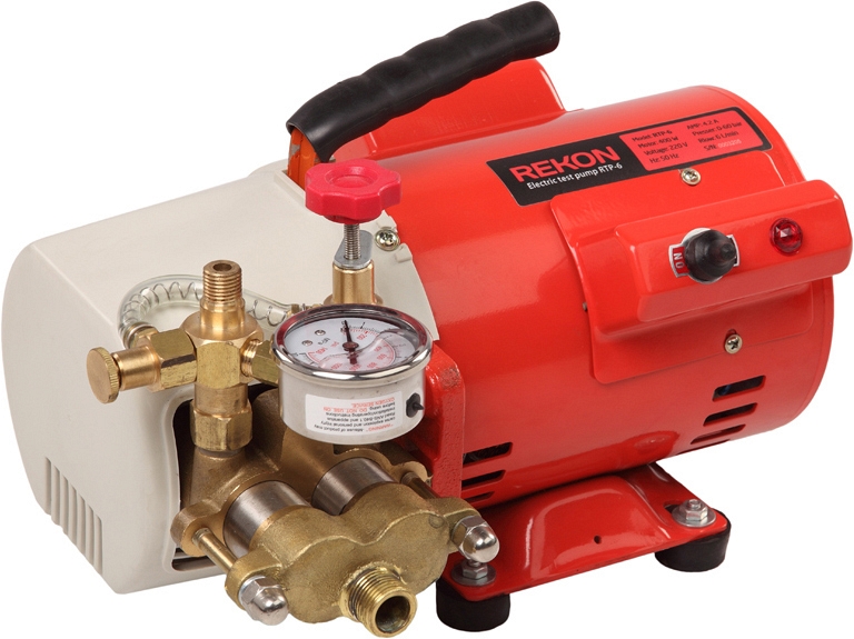 Электрический опрессовщик Rekon RTP-6 (Рекон РТП-6) – электрический опрессовочный насос для точной и быстрой проверки давлением герметичности трубопроводов и резервуаров в системах водоснабжения, теплоснабжения, канализации; сжатого воздуха; солнечных батареях; холодильных установках; системах, заполненных маслом; при изготовлении бойлеров, баллонов со сжатым газом; в котлостроении; при производстве напорных резервуаров; в разводке спринклеров.