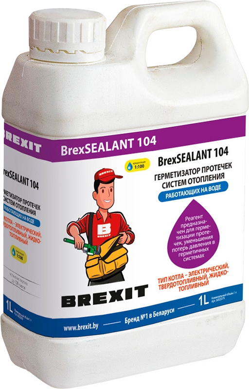 Герметизатор протечек систем отопления на воде Brexit BrexSealant 104 (Брекзит БрекзСиалант 104) – профессиональное средство, жидкий самоуплотняющийся герметик для герметизации, устранения течей, протечек, микротрещин в системах отопления с электрическими (кроме электролизных), твердотопливными, жидкотопливными котлами, работающими на воде, связанных с потерями давления в герметичных инженерных системах. Применяется для ремонта систем отопления, в которых затруднительно применение средств наружного действия.