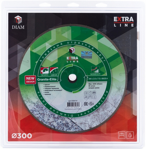 Круг отрезной алмазный Diam Extra Line 1A1R Корона Granite-Elite 300 мм (Диам Экстра Лайн 1А1Р Корона Гранит-Элит 300 мм) – премиальный алмазный диск для мокрой резки гранита, керамогранита, твердой керамики, кварцевого агломерата, оникса, мрамора, габбро, лабрадорита, базальта и других пород твердого натурального камня на бензорезах, электрических резчиках и плиткорезах, камнерезных станках, стенорезных машинах, швонарезчиках с подачей воды. За долгое время зарекомендовал себя с отличной стороны у многих мастеров, как инструмент, обеспечивающий очень качественное выполнение задач практически по всем твердым материалам, при этом имеет очень большой ресурс и скорость работы.