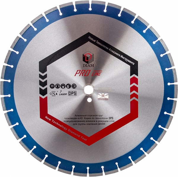 Сегментный алмазный круг Diam Pro Line 1A1RSS Железобетон 500 мм (Диам Про Лайн 1А1РСС Железобетон 500 мм) – профессиональный алмазный отрезной диск с лазерной сваркой сегментов, произведенный по технологии DPS – позиционирования алмазов в режущем слое, для сухой и мокрой резки железобетона, старого высокопрочного бетона, огнеупоров на камнерезных станках, стенорезных машинах, швонарезчиках, как с охлаждением, так и без.