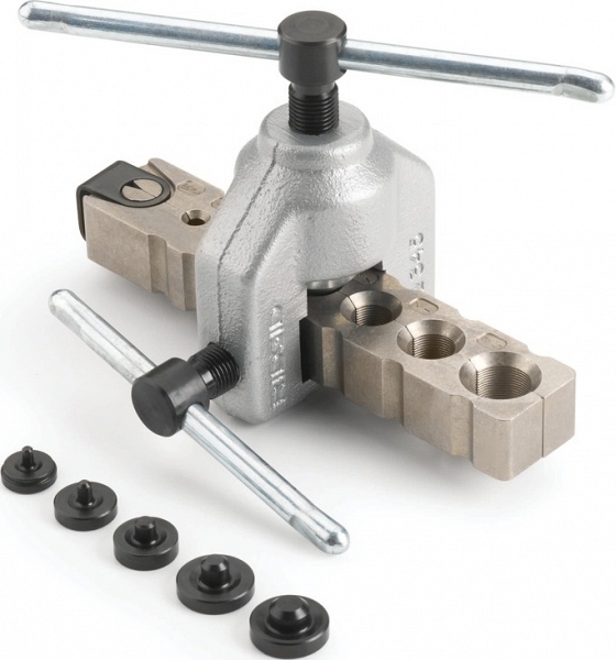 Стандартная развальцовка Ridgid 345-DL (Риджид 345-ДЛ) с переходниками для развальцовки SAE-раструбов 45° с двойным загибом 3/16", 1/4", 5/16", 3/8", 7/16", 1/2" – высокоточный инструмент для развальцовки под углом 45° (создания SAE-раструбов 45° с одиночным и двойным загибом) труб Ø 3/16", 1/4", 5/16", 3/8", 7/16", 1/2", 5/8" из отожженой меди, латуни, алюминия и мягкой стали.