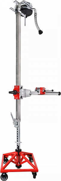 Телескопическая распорная станина для потолочного алмазного бурения Bycon DSP-3000 (Байкон ДСП-3000) – профессиональная, удобная, легкая, компактная, устойчивая и надежная стойка c прочным стальным основанием для распорного (безанкерного) крепления к поверхностям, транспортировочными колесами, водосборным кольцом, быстросъемным креплением двигателя для корончатого, колонкового, потолочного, вертикального и горизонтального сверления отверстий Ø до 200 мм в бетоне, железобетоне, кирпиче, камне и других материалах с использованием дрелей и двигателей для алмазного бурения всех производителей с диаметром шейки 60 мм или пластиной крепления на 4 болта, с подачей и без подачи воды. Оптимальный алмазный штатив идеально подходит для сантехнических и электрических работ, гражданского строительства и ландшафтных работ.