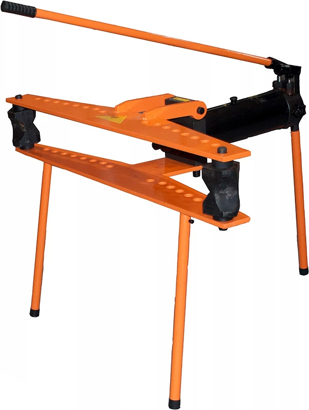- Тип: ручной гидравлический (продавливает заготовки при помощи гидравлической направляющей) – отличен от других вариантов ручных трубогибов тем, что его привод усилен гидравликой, что позволяет монтажнику прикладывать меньше усилий и тратить гораздо меньше времени при гибки стальных труб