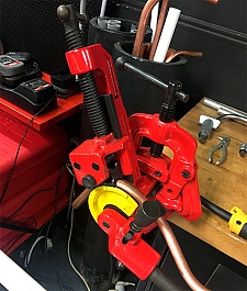 – Желтые стандартные сегменты: Ø труб 10 – 22 мм, толщина стенки труб 1 - 1,5 мм, угол изгиба 0° – 180°, малый радиус изгиба - Дополнительная принадлежность для крепления на верстаке: опорное основание, в которое устанавливается трубогиб, экономит место и позволяет работать в горизонтальном и вертикальном положении, хранится в чемодане для трубогиба