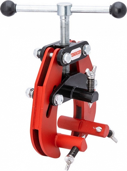- Прочная стальная конструкция из кованной стали повышенной прочности состоит из стальной рамы с 2-мя ножками с регулировочными винтами и верхнего прижима с затяжным винтом, которые регулируют размер охватываемых труб с лапкой и винтом центровки, надежность и безопасности использования