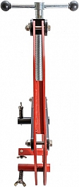 - Конструкция состоит из стальной рамы с 2-мя ножками с регулировочными винтами и верхнего прижима с затяжным винтом, которые регулируют размер охватываемых труб с лапкой и винтом центровки