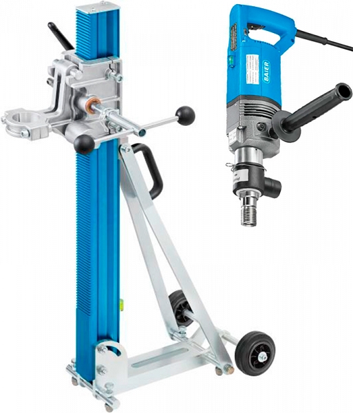 Установка алмазного бурения с микроударом Baier BDB 825/BST 200 (Байер БДБ 825/БСТ 200) с функцией мягкого удара предназначена для точного ручного и наклонного, высокоточного, колонкового (корончатого), стационарного (со станиной) сухого сверления отверстий Ø 60 – 200 мм в бетоне, железобетоне, камне, кирпиче, под углом до 45°, без подачи воды.